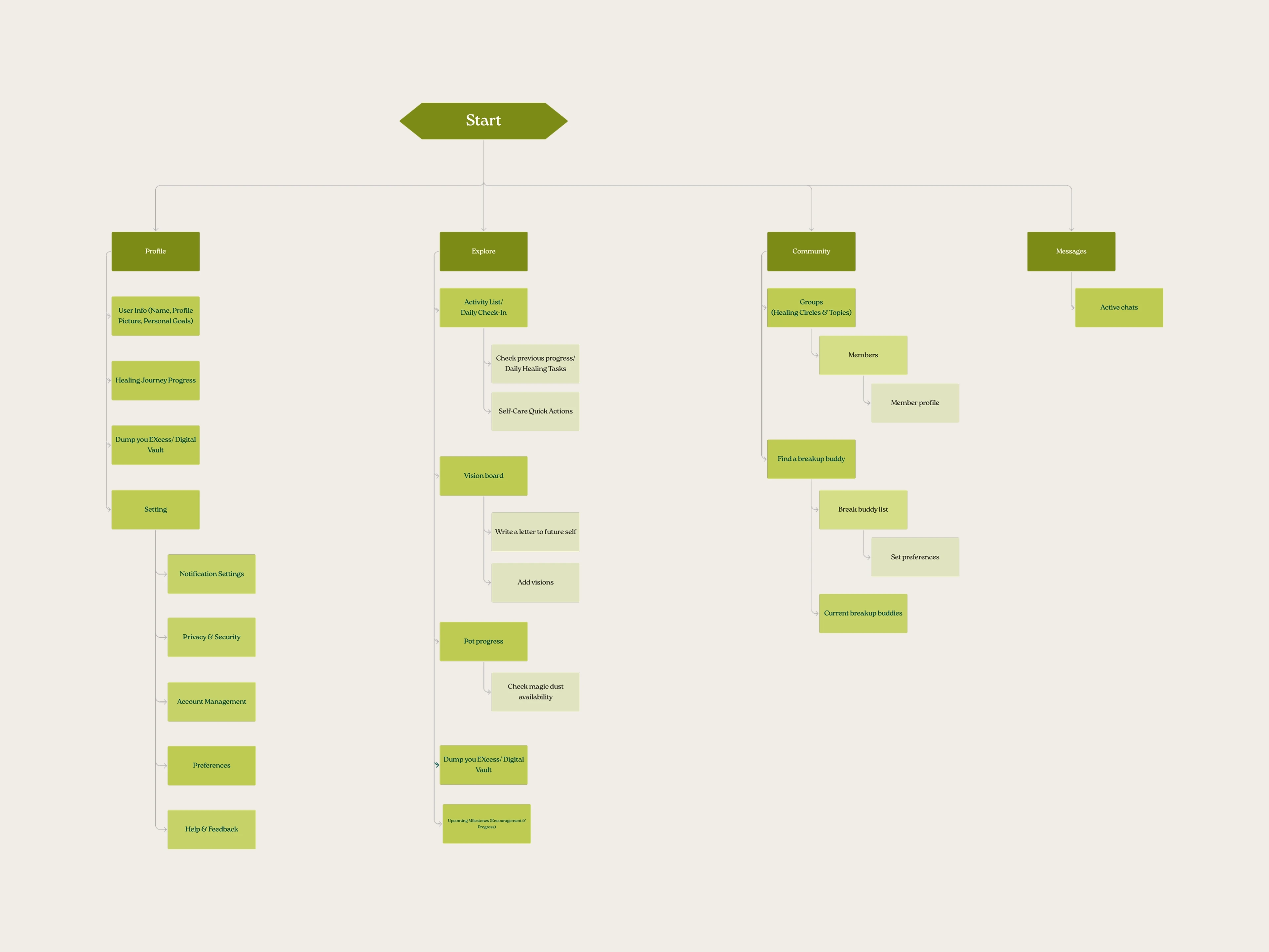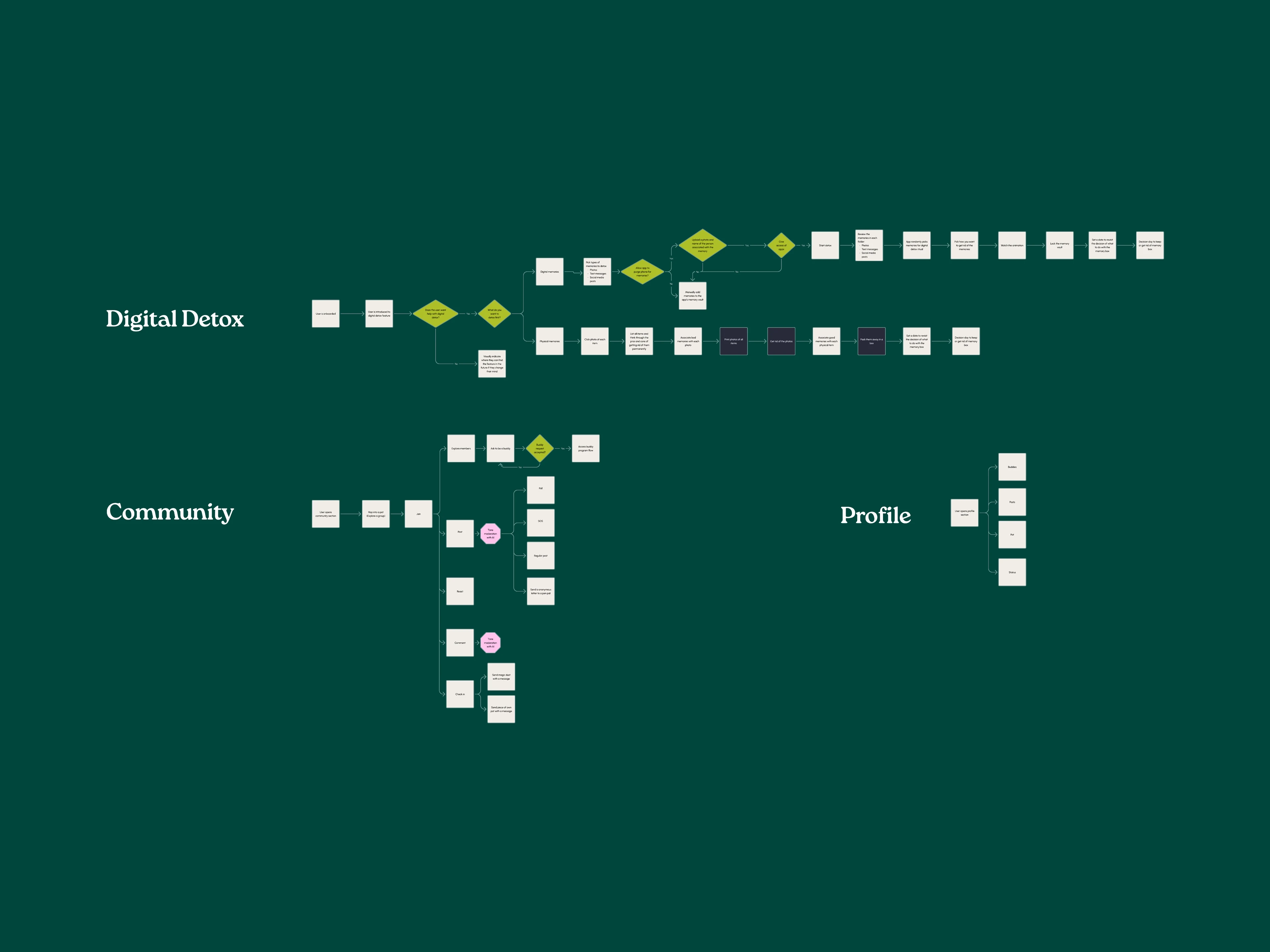 The final navigation prioritized clarity and emotional ease, with four primary areas: Home, Explore & Community, Messages, and Profile. Key user flows included onboarding, finding a buddy, and engaging with reflective activities.