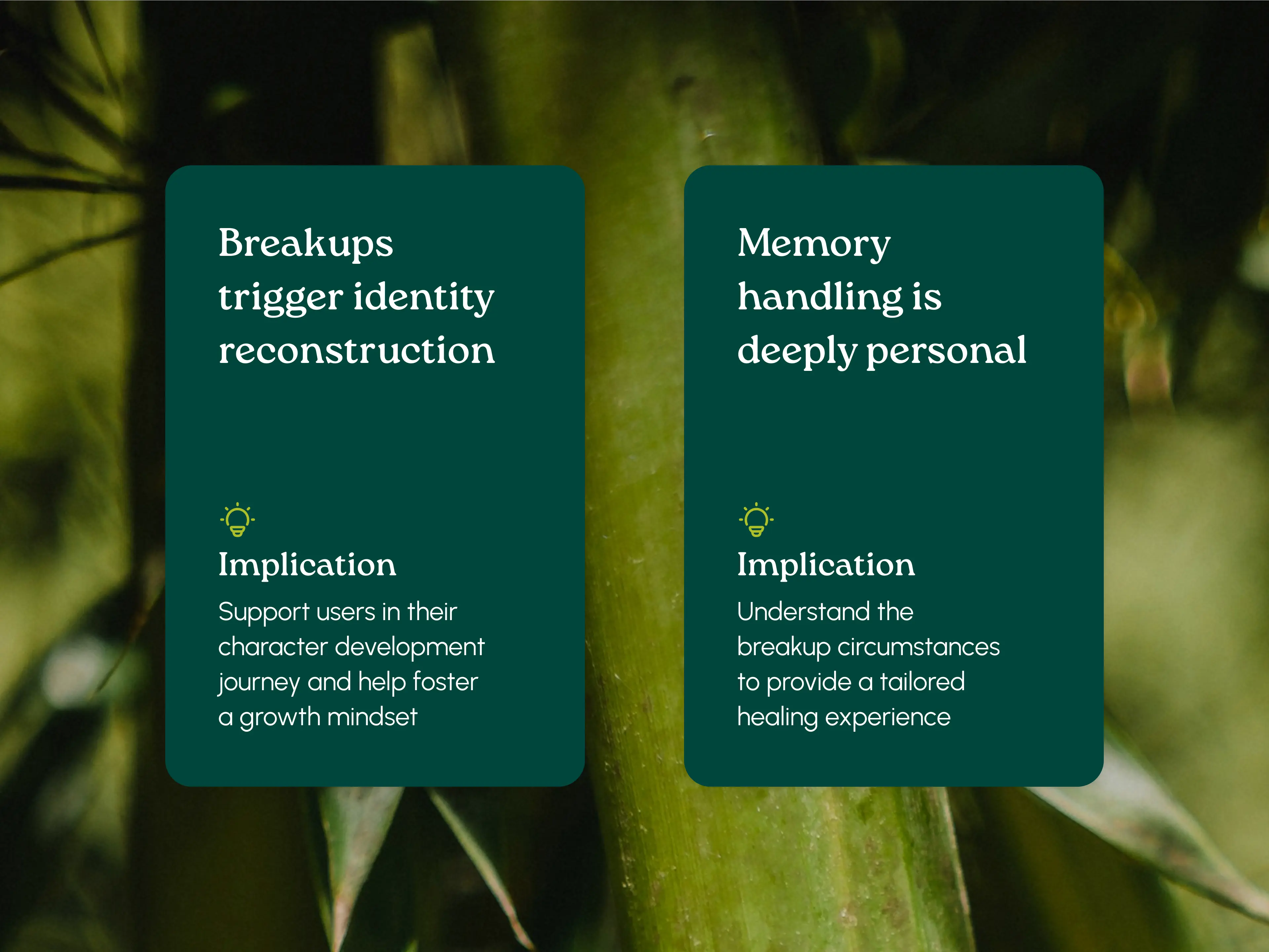 Breakups trigger identity reconstruction. Participants described heartbreak not only as loss, but as a moment of self-redefinition. This reframed the product goal from emotional relief to long-term growth.